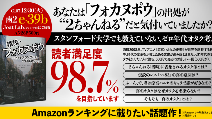 あなたは「フォカヌポウ」の出処が “2ちゃんねる”だと気付いていましたか? ―スタンフォード大学でも教えていない、ゼロ年代オタク考。 西暦2008年。TVアニメ『涼宮ハルヒの憂鬱』が世界を席巻する最中、時代の変革を示唆したある文書が産み落とされた―― ・2ちゃんねる(当時)に表象されるオ […]